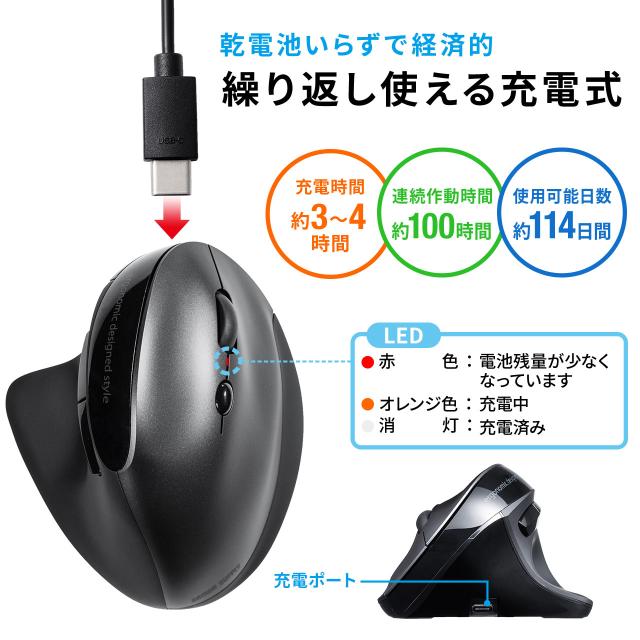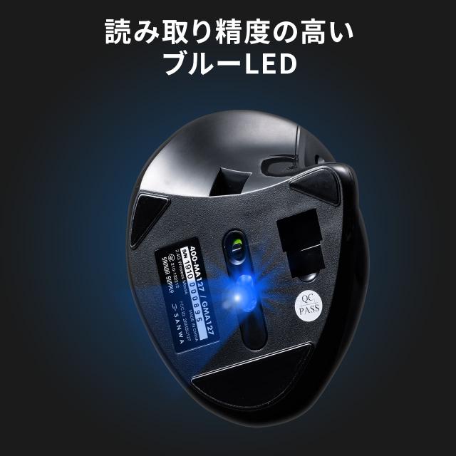 ワイヤレス エルゴノミクスマウス USB充電式 高感度ブルーLEDセンサー 5ボタン 静音ボタン[400-MA127]