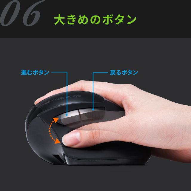 ●手首を捻らずに握れる、人間工学に基づいた形状のワイヤレスマウスです。●押しやすい大型の戻る・進むボタンを搭載しています。