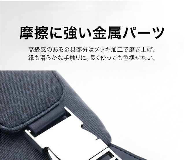 ファスナーやバックル部分には耐久性に優れた金属パーツを使用。 日常使用でも劣化しにくく、安心してお使いいただけます。 |