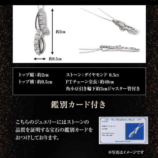 【素材・商品サイズ】ストーン:天然ダイヤモンド 0.3ct UP スイート10 金性:プラチナPT900 (チェーンPT850) トップ:縦約2cm×横約0.5cm チェーン:小豆チェーン 全長 約40cm (引き輪下約3cmアジャスター管付き) 付属品:鑑別カード付き