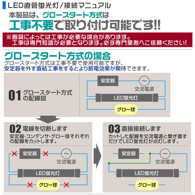 | 注意事項 | ・グロースターター方式の器具は、グロー点灯管を取り外すだけで、そのままご使用できます。 ・一般蛍光管と交換するだけでご使用できます。ただし、ひとつの灯具に一般蛍光管や他のLED蛍光灯と混ぜて使用しないでください。 ・ラピッドスタート方式、インバーター方式、電子安定器、調光できる安定器を持つ灯具、他社LED蛍光灯などのために配線加工や改造をされた灯具は使用できません。 また取り付けないで下さい。 無理に使用を続けると、動作異常となったり、灯具や本製品が故障することがあり、まれに発煙、発火に至るおそれがあります。 |