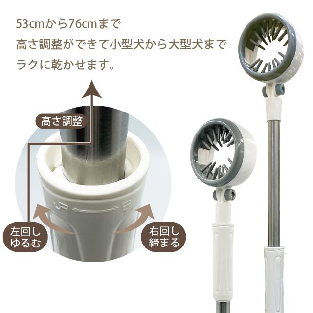 長さが53cm〜76cmまで調整できるので小型犬から大型犬まで楽に乾かせます。