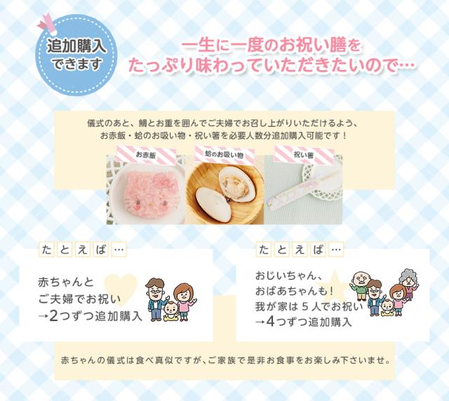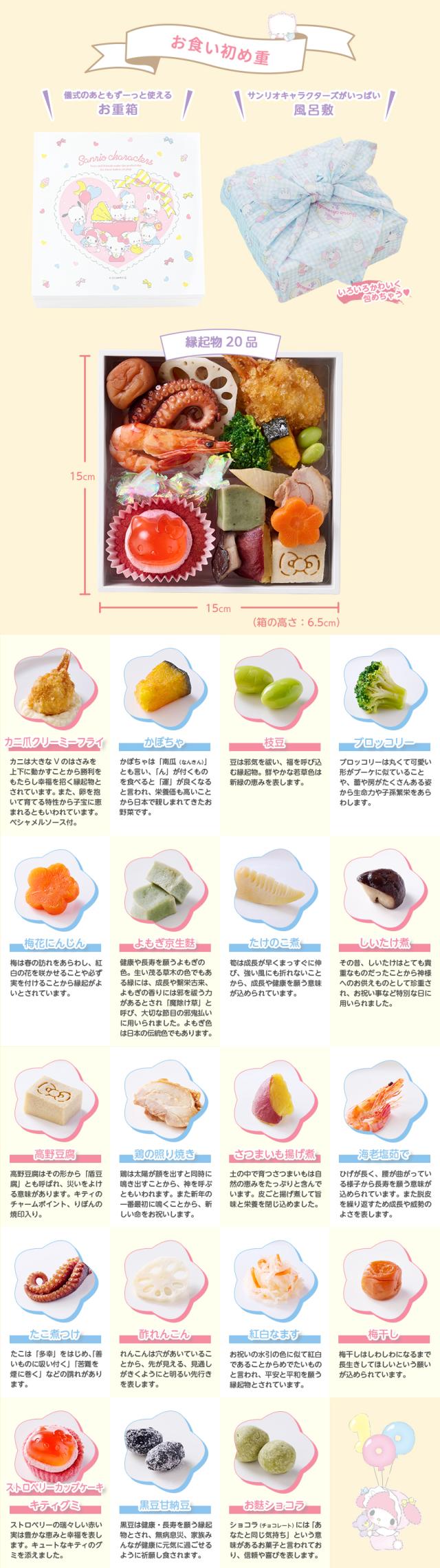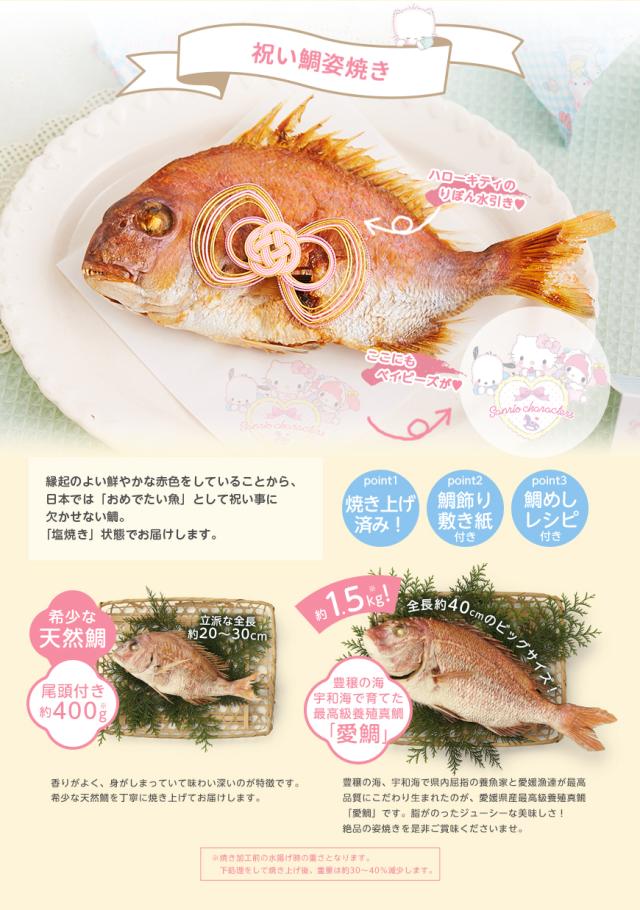 | 内容量 | ●祝い鯛姿焼き(水揚げ時加工前400g / 下処理焼き加工後190g) ●お食い初め重 ※一部お料理の内容が変更になる場合がございます。 ●キティお赤飯(約60g) ●おかおシート ●蛤 ●お吸い物の素 ●キャラフル(約20枚入) ●生クリーム4号ケーキ(直径約12cm) ●アイシングクッキー4枚 ●歯固めの石 ●祝い箸 ●鯛飾り ●敷き紙(白) ●ネームカード ●フォトカード ●風呂敷 ●お食い初めの手引書 |