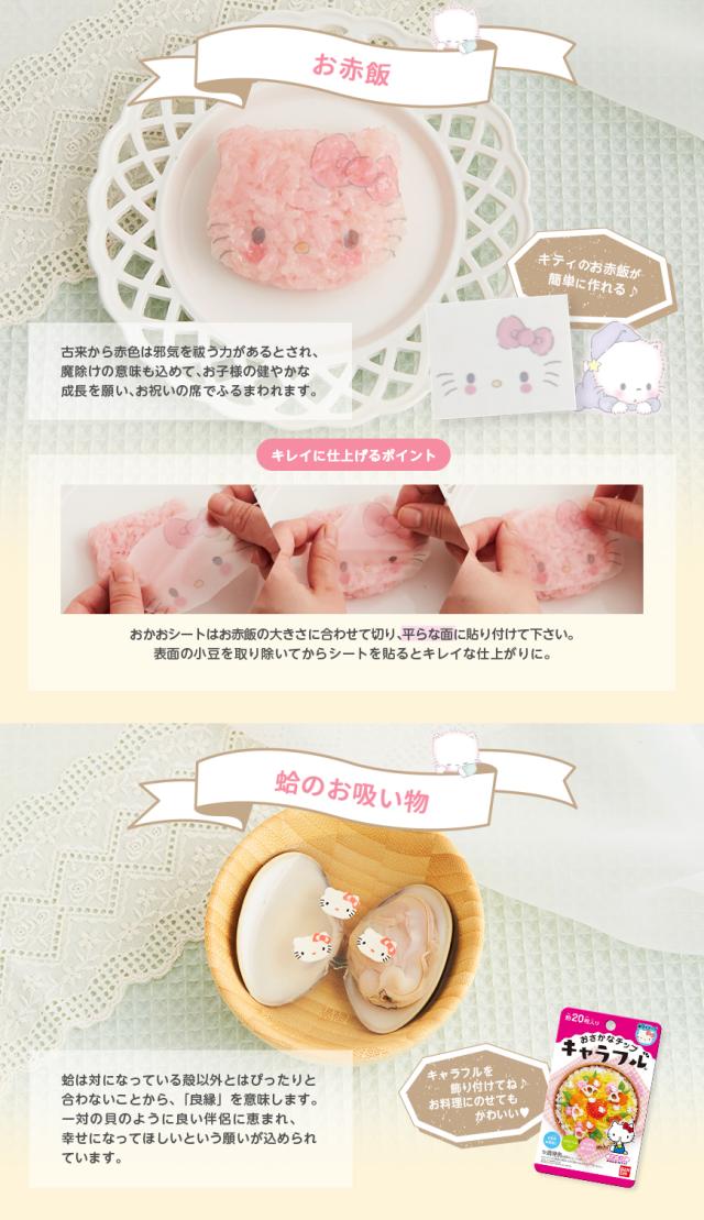 キティのトレードマーク的な”リボン”の鯛飾りがついたお祝い鯛、キティお赤飯、キティキャラフル付きの蛤吸、縁起物お料理20品、祝箸に歯固め石がセットになっています。
