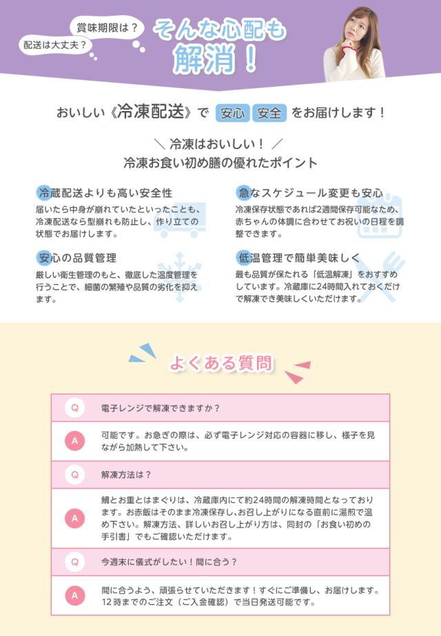 | 原材料 | ●鯛:真鯛、塩 (※季節や漁獲量によっては異なる調味料[酒、醤油、穀物酢、ベニコウジ色素、(原材料の一部に大豆、小麦を含む)]を使用する場合がございます) ●お食い初め重:別資料参照 ●お赤飯:もち米(国産)、小豆、食塩/着色料 ●おかおシート: でんぷん、寒天/ゲル化剤(増粘多糖類)、グリセリン、乳化剤、着色料(赤3、青1、黄4) ●お吸い物:食塩、麩、ねぎ、のり、調味料(アミノ酸等)、香料 ●キャラフル:澱粉、魚肉すり身(たら)、還元水飴、食塩、砂糖/炭酸Ca、調味料(アミノ酸)、乳化剤、着色料(イカ墨、紅麹) ●蛤:千葉県九十九里産はまぐり ●生クリーム4号ケーキ:生クリーム、乳等を主要原料とする食品(乳成分・大豆を含む)、液鶏卵、苺、砂糖、米粉、白桃シロップ漬け、黄桃シロップ漬け、粉末油脂(植物油脂、コーンシロップ)、マーガリン、砂糖混合異性化液糖、乳化剤、香料、膨脹剤、pH調整剤、安定剤(増粘多糖類)、酸味料、カロチン色素【アレルギー:乳・大豆・卵・もも】 ●アイシングクッキー(焼き菓子):小麦粉(国内製造)、マーガリン、卵、粉糖、食塩、乾燥卵白、着色料(黄色4号・黄色5号・赤色3号・赤色40号・青色1号・青色2号)※原材料の一部に小麦、卵、乳成分を含む ●歯固め石:新那智黒石(自然玉)磨きタイプ 約3〜4cm ※天然石の為大きさや形に個体差があります ●祝箸:【箸袋】上質紙/【箸】国産柳 ●お重箱:ABS(樹脂) ●ネームカード:上質紙 ●フォトカード:上質紙 ●風呂敷:ポリエステル100% |