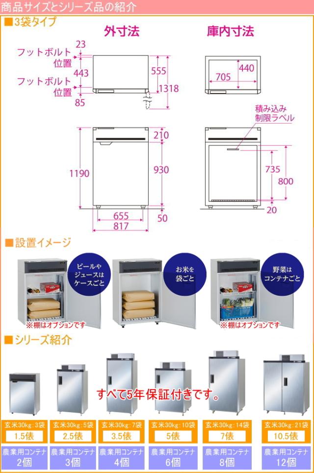 | 注意 | 高温多湿で風通しが悪い場所に設置されますと、結露を起こしてしまうことがございます。 結露してしまうとまずい場所に設置される場合は、別売りの防水パンをご使用ください。 ただし、防水パンは一番小型の30kg×3袋タイプ専用(1.5俵)となっております。 30kg×3袋以外のサイズについては、室外での使用を想定しているため防水パンはございませんのでご了承ください。(雨風を防げる場所に設置してください) ※本品は冷却機能しかないため、外気温が低い場合は温度設定ができません。 |