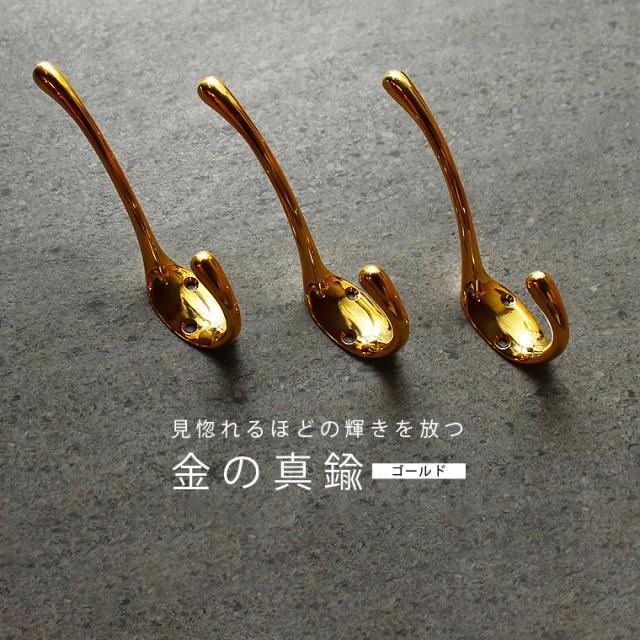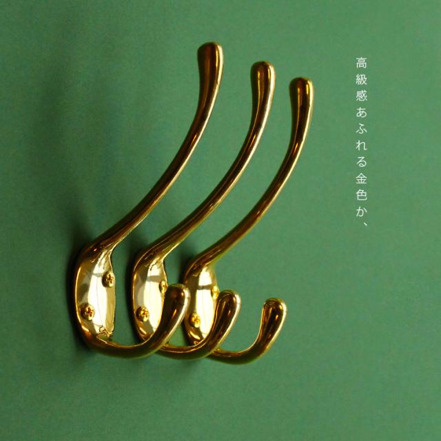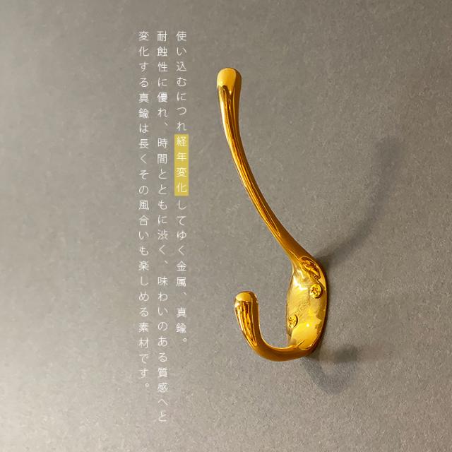 シンプルながら重厚感、アンティーク感のあるデザインの真鍮フック「ダブルフック ブラス」3個セット!