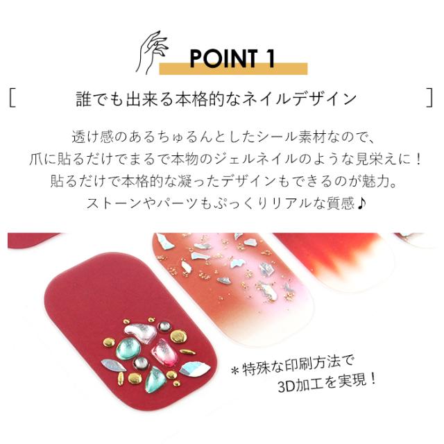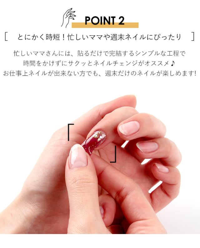 | 商品説明 | まるで本物のジェルネイル?! 貼るだけ簡単着せ替えネイル♪リアルジェルネイルステッカー ニュアンスネイルや天然石ネイルなど可愛いデザインも入荷!! 豊富なデザインバリエーションの中から気分に合わせてネイルチェンジ とにかく時短!忙しいママや週末ネイルにもピッタリ お仕事上ネイルができない方でも、週末だけのネイルが楽しめます♪ 貼るだけで完結するシンプルな工程で時間をかけずにサクッとネイルチェンジでき オフする際はぺりっと剥がすだけ♪ シールなら貼り替えるだけなので自爪への負担もほどんどありません! |