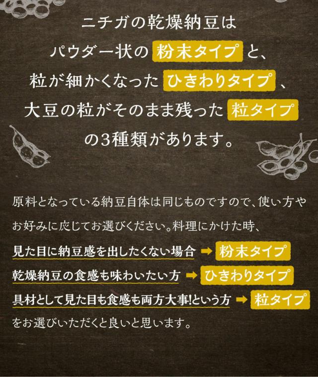 | 納豆 粉末(日本) | 大豆(宮城県産タチナガハ大粒1等品) | 日本 |