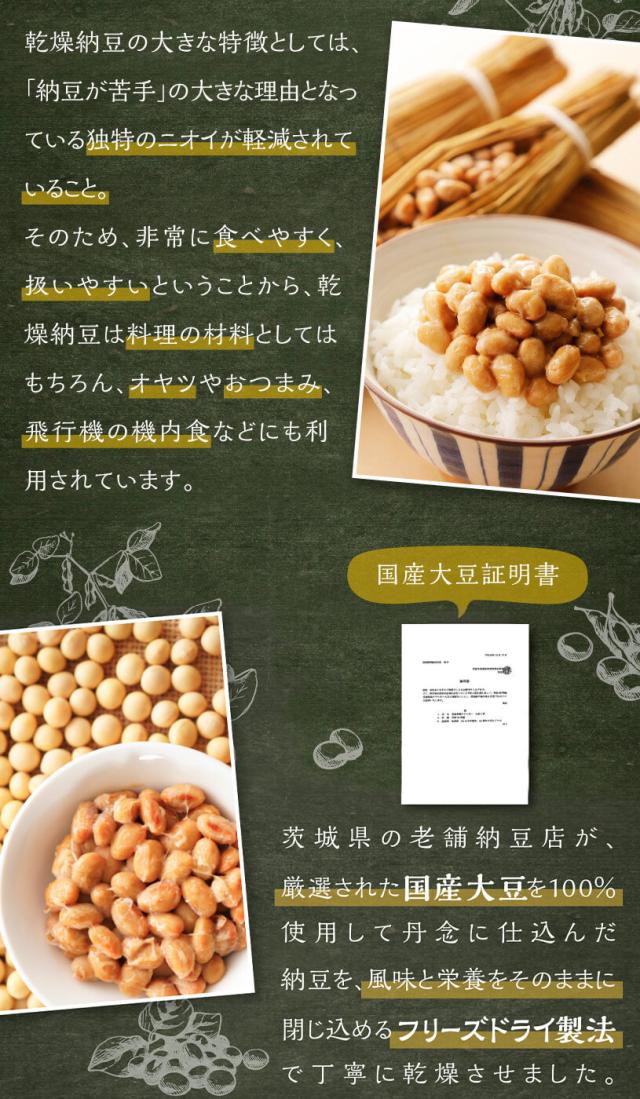 日本の伝統的健康食品、国産大豆を100%使用して作られた老舗納豆屋の納豆を「フリーズドライ製法」によって加工しています。加熱工程もなく、余計なものは一切入れておりません。