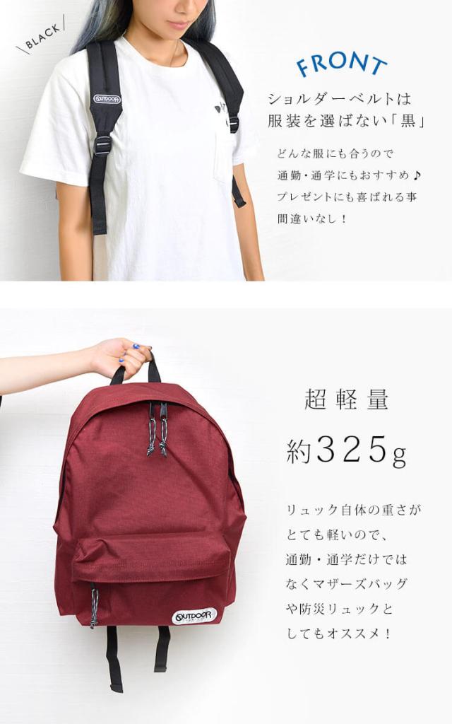 リュック レディース OUTDOOR PRODUCTS アウトドア プロダクツ リュックサック outdoor リュック メンズ 通学 通勤 18L a4 おしゃれ シンプル 大容量 軽量 丈夫 コーデュラ 子供 高校生 大人 遠足 旅行 防災 カラフル マザーズバッグ 452 送料無料