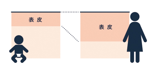 赤ちゃんの肌は大人とどうちがうの?肌の厚さの違い 肌の表皮の厚さは、大人が2〜3mmなのに対して、子供は1〜2mm。大人の約半分の厚さです。そのため気温の変化、乾燥、ハウスダストなど外部からの影響を受けやすくなっています。 ![]() 汗腺の数は大人と同じ 赤ちゃんの汗腺の数は大人と同じ!つまり汗っかきで汚れやすいということ。生後約3か月までは皮脂分泌が活発で汚れやすく、4か月過ぎ頃からは皮脂分泌が減少し、乾燥しやすいお肌に。 ![]() バリア機能が未熟 常にさらされているほこりや微粒子などの刺激物質をブロックするには、お肌にうるおいが必要であり、お肌の内側にある水分が逃げていかないようにするために“バリア機能”があります。 | ||||||||||||
