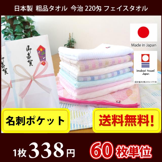 【送料無料】 タオル 粗品タオル 国産 日本製 今治 薄手のフェイスタオル のし 名刺ポケット付きビニール 粗品 お年賀タオル 60枚単位 今治タオル