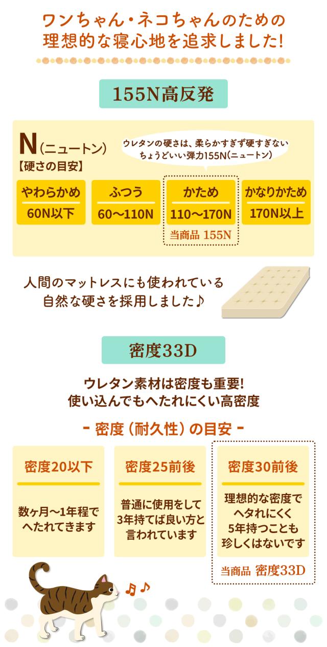 【寝心地と耐久性をキープ】中身の素材は33Dウレタンを採用しており、人間のマットレスにも採用されるほどのしっかりとしたウレタンを利用しています。品質に妥協しない製品を創り出すことで、今までにない高品質なペットベッドでペットライフをより良いものにしていただきたいと思っています。
