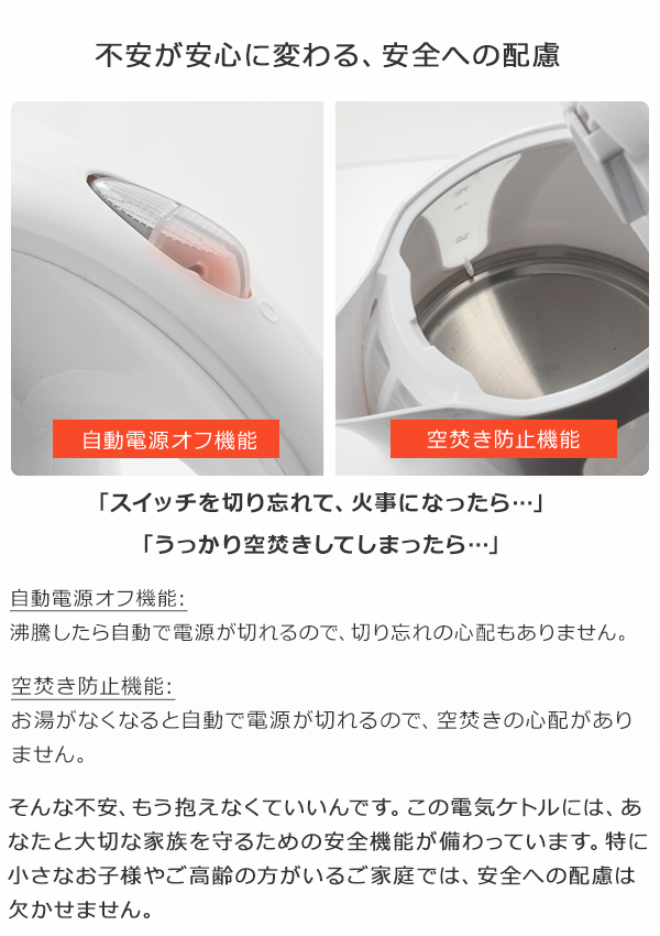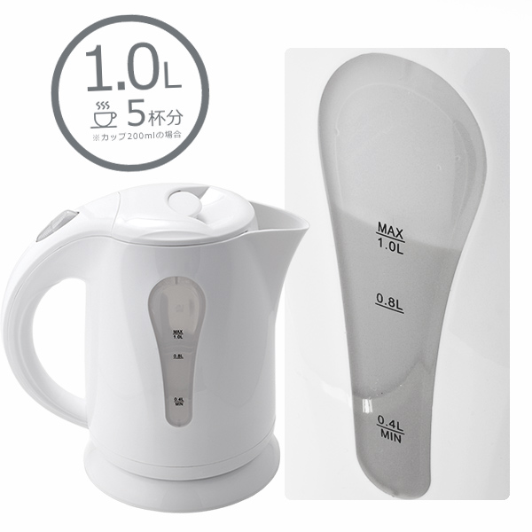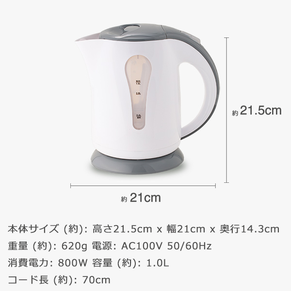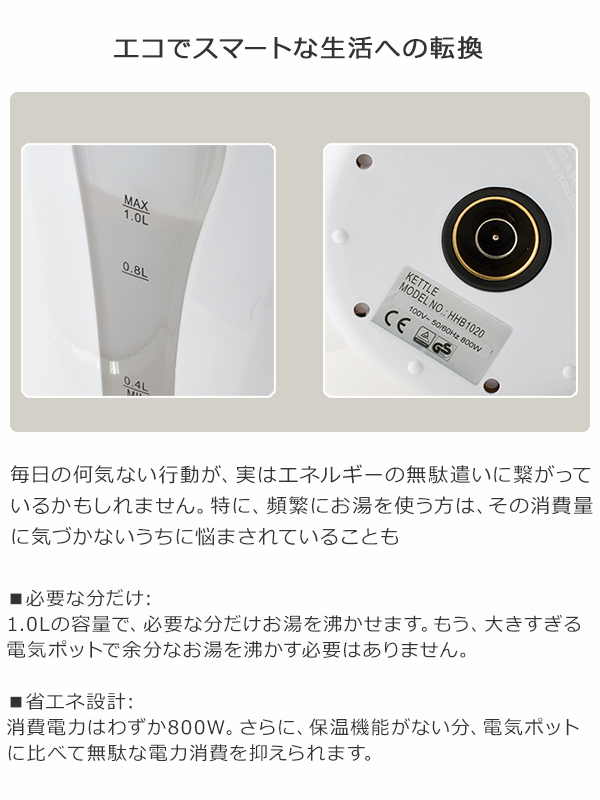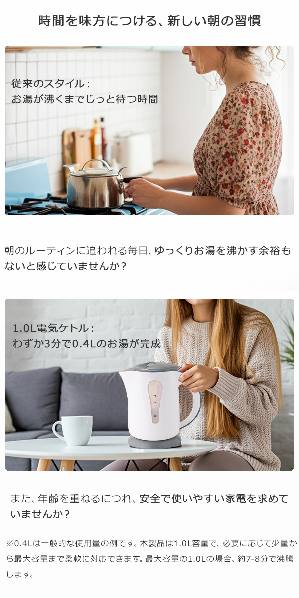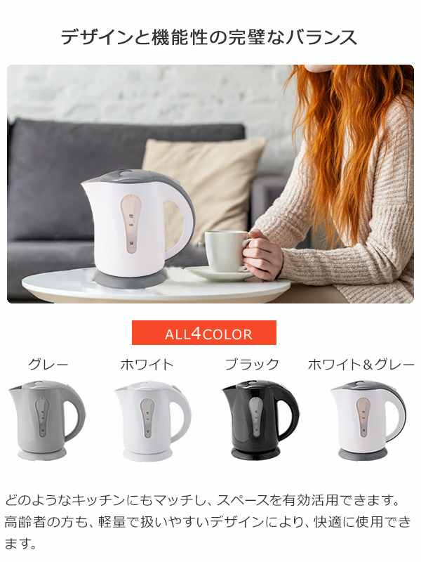 忙しい朝を、スマートに変える - 1.0L電気ケトル \1.0L電気ケトルのここがイイ/ ■迅速な沸騰時間 わずか3分で0.4Lのお湯を沸かせます。 ■安全性と使いやすさ 軽量設計(約620g)で、高齢者の方も扱いやすいです。 ■コンパクトでスタイリッシュなデザイン 4つのカラーバリエーションで、どんなキッチンにもマッチします。 ■エコフレンドリーな設計 1.0L容量で必要な分だけお湯を沸かせ、無駄を省きます。 【1.0L電気ケトルは幅広い年齢層のユーザーに便利で使いやすい製品となっています!】 1. 時間を味方につける、新しい朝の習慣 朝のルーティンに追われる毎日、ゆっくりお湯を沸かす余裕もないと感じていませんか? また、年齢を重ねるにつれ、安全で使いやすい家電を求めていませんか? 従来のスタイル: お湯が沸くまでじっと待つ時間 1.0L電気ケトル: わずか3分で0.4Lのお湯が完成 ※0.4Lは一般的な使用量の例です。本製品は1.0L容量で、必要に応じて少量から最大容量まで柔軟に対応できます。 最大容量の1.0Lの場合、約7-8分で沸騰します。 朝の貴重な時間を有効活用できるようになります。この時間の使い方、あなたならどうしますか? 高齢の方も、素早く安全にお湯を沸かせるこの利便性をどう感じますか? 2. スマートな暮らしへの第一歩 キッチンに立つ時間を最小限に抑えたい、または頻繁にお湯を使う方にとって、効率的な方法を求めていませんか? 従来の方法: コンロでお湯を沸かし、火の元を気にする 1.0L電気ケトル導入後: ボタン一つで安全・迅速にお湯が沸く キッチンでの作業効率が格段に向上し、より多くの時間を自分のために使えるようになります。 高齢者の方も、安全で使いやすい設計により、快適にお湯を沸かすことができます。 3. 不安が安心に変わる、安全への配慮 「うっかり空焚きしてしまったら…」 「スイッチを切り忘れて、火事になったら…」 そんな不安、もう抱えなくていいんです。この電気ケトルには、あなたと大切な家族を守るための安全機能が備わっています。 特に、小さなお子様やご高齢の方がいるご家庭では、安全への配慮は欠かせません。 空焚き防止機能: お湯がなくなると自動で電源が切れるので、空焚きの心配がありません。 自動電源オフ機能: 沸騰したら自動で電源が切れるので、切り忘れの心配もありません。 これらの機能があることで、あなたは安心して他の家事に集中したり、ゆっくりお茶の時間を楽しんだりできます。 キッチンに笑顔が増え、心穏やかな日々が待っています。 4. デザインと機能性の完璧なバランス キッチンの見た目が気になる方、スペースに悩んでいる方、または使いやすさを重視する高齢者の方はいませんか? ・コンパクトサイズ:高さ21.5cm x 幅21cm x 奥行14.3cm ・スタイリッシュなカラーバリエーション:グレー、ホワイト、ブラック、ホワイト&グレー ・軽量設計:約620gで持ち運びも楽々 どのようなキッチンにもマッチし、スペースを有効活用できます。 高齢者の方も、軽量で扱いやすいデザインにより、快適に使用できます。あなたのキッチンがどう変わるか、想像してみてください。 5. エコでスマートな生活への転換 毎日の何気ない行動が、実はエネルギーの無駄遣いに繋がっているかもしれません。 特に、頻繁にお湯を使う方は、その消費量に気づかないうちに悩まされていることも。 ■必要な分だけ: 1.0Lの容量で、必要な分だけお湯を沸かせます。もう、大きすぎる電気ポットで余分なお湯を沸かす必要はありません。 ■省エネ設計: 消費電力はわずか800W。さらに、保温機能がない分、電気ポットに比べて無駄な電力消費を抑えられます。 ■エコな選択: 小さな工夫が、大きな節約に繋がります。電気代を節約できるだけでなく、環境にも貢献できます。 もう、必要以上にお湯を沸かす必要はありません。小さな変化が、大きな節約とゆとりある時間につながります。 この1.0L電気ケトルで、あなたの日常をもっとスマートに、もっと豊かに、そしてもっと安全にしませんか? 年齢を問わず、誰もが使いやすい設計で、あなたの新しい生活様式を応援します。 【製品情報】 商品名: 1.0L 電気ケトル カラー: グレー、ホワイト、ブラック、ホワイト&グレー 本体サイズ (約): 高さ21.5cm x 幅21cm x 奥行14.3cm 重量 (約): 620g 電源: AC100V 50/60Hz 消費電力: 800W 容量 (約): 1.0L コード長 (約): 70cm ※このページは1.0L電気ケトルの商品ページです。 以前掲載されていた、1.2L電気ケトルのレビューは、この製品に関するものではありません。 1.0L電気ケトルは、1.2L電気ケトルの後継商品となります 【商品特徴・キーワード】 1.0L 電気ケトル おすすめ コンパクト 省エネ おしゃれ 安全 速い 湯沸かし 一人暮らし ステンレス 温度調節機能付き コーヒードリップ用 保温機能 軽量 静音 コードレス 人気ブランド 【使用上の注意】 子供の手の届かない、又コードが足等に引っ掛からない場所に設置してください。 ・ケトル本体に水が入っていないときは、スイッチ