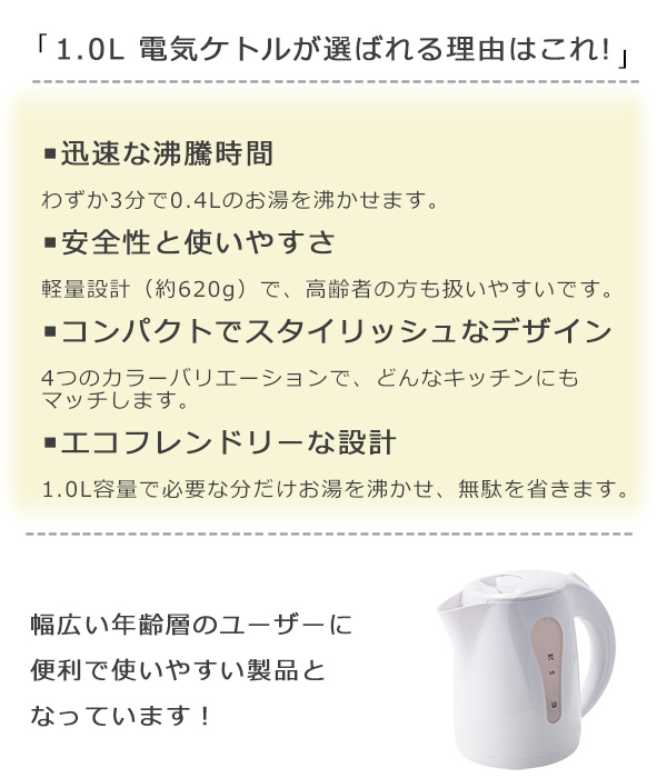 【1.0L電気ケトルは幅広い年齢層のユーザーに便利で使いやすい製品となっています!】