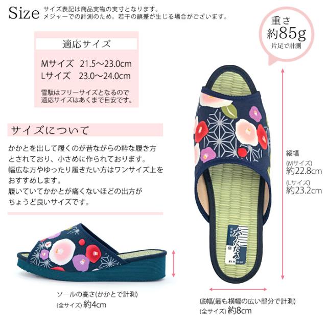 | 一年中快適に履ける日本製のタタミスリッパ♪ 天然のタタミ(い草)雪駄は通気性があり足の裏に熱をためず、足の裏が蒸れにくくいつも快適です。 外でも室内でも履ける!ライフスタイルによって使い分けができます。 日本の職人さんが作った、細かいところまで丁寧な仕上がりです。 ■ブランド:竹春(TAKEHARU) ■生産地:日本 ■メイン素材:い草い草(熊本県産)、アッパー生地(京都) ■重量:(約)85g(片足で計測) ■適応サイズ(目安):M21.5〜23.0cm、L23.0〜24.0cm 【サイズについて】 フリーサイズとなりますので、適応サイズはあくまで目安となります。 かかとが少し出るよう小さめのつくりとなっております。 かとをおさめて履きたい場合や、甲幅の広い方はワンサイズ上の商品ををおすすめします。 実寸サイズは画像をご確認ください。 <ご注意> ※大きな布から型をとっておりますので、画像と柄の位置が若干異なる場合がございます。 仕様となりますのでご了承くださいませ。 ※商品は防水されておりません。カビなどの原因となりますので、雨天時はご使用をお控えください。[2011] |