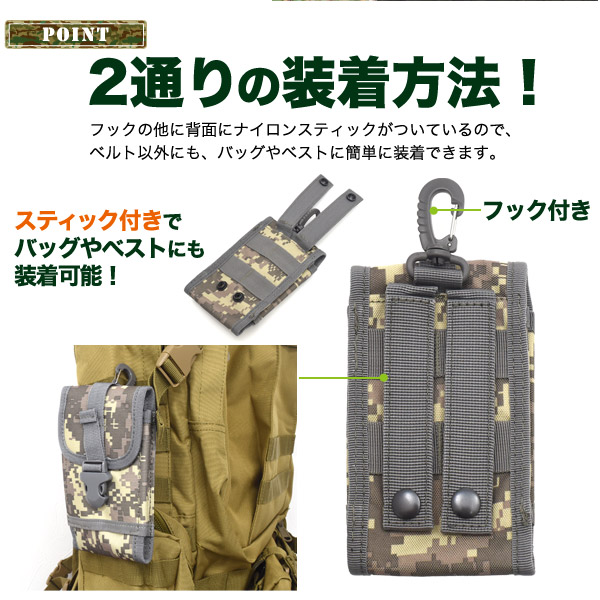 ベルトポーチ ミリタリーポーチ スマホポーチ フック スティック付き 2通りの装着方法 迷彩柄 ガジェットポーチ ギフト 贈り物 プレゼント サバゲー サバイバルゲーム シザーケース ウエストバッグ ミリタリーデザイン ミリタリ系 小物入れ アウトドア キャンプ 旅行