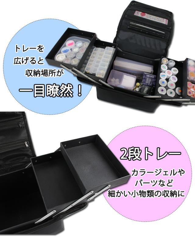 ネイルバッグに荷物を詰め込みすぎると重みでベルトが緩くなる場合がございます。 ・トレイ部分にジェルリムーバーやクレンザーが付着すると変色する場合がございますので