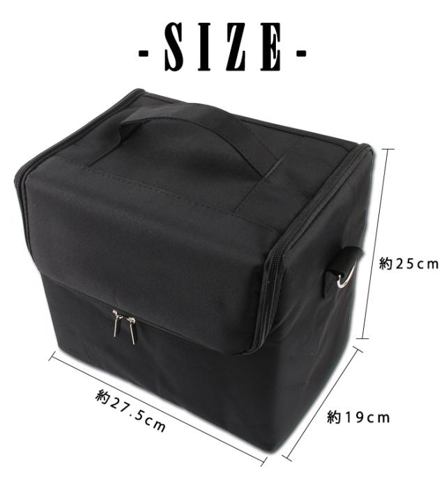 | サイズ | 本体:約27.5cm× 約19cm× 約25cm トレー部分:(大)約16.5cm×約15.5cm×約18.5cm (小)約13cm×約3.5cmcm×約18.5cm メッシュポケット部分:(1)約24cm×約13cm (2)約24cm×約8.5cm (3)約24cm×約8.5cm |