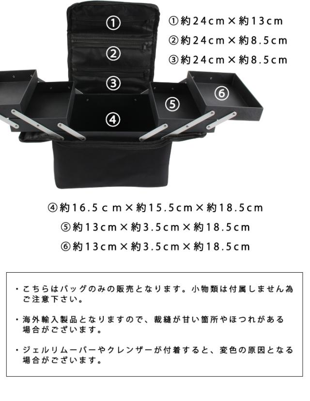 | 注意事項 | ・バックのみの販売となります。 ・海外輸入製品のため、裁縫が甘い箇所やほつれがある場合がございます。 ・ショルダーベルトご使用の際、 ネイルバッグに荷物を詰め込みすぎると重みでベルトが緩くなる場合がございます。・トレイ部分にジェルリムーバーやクレンザーが付着すると変色する場合がございますので ご注意ください |