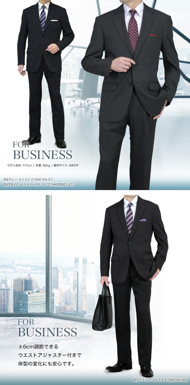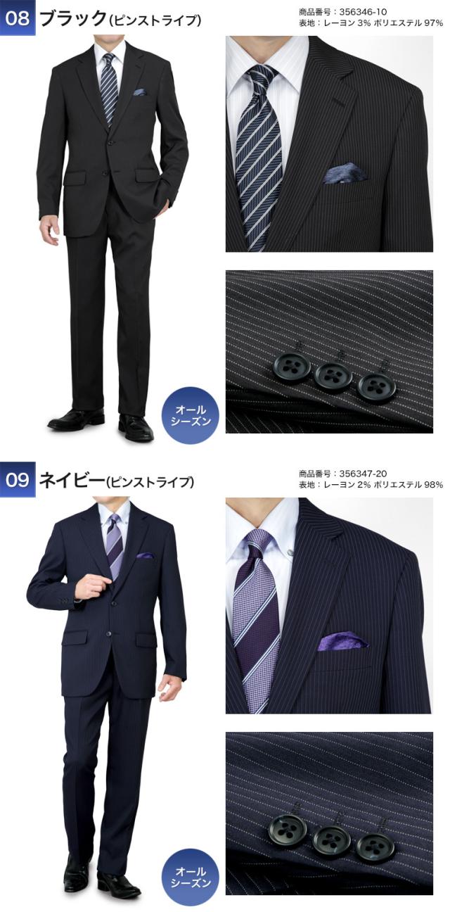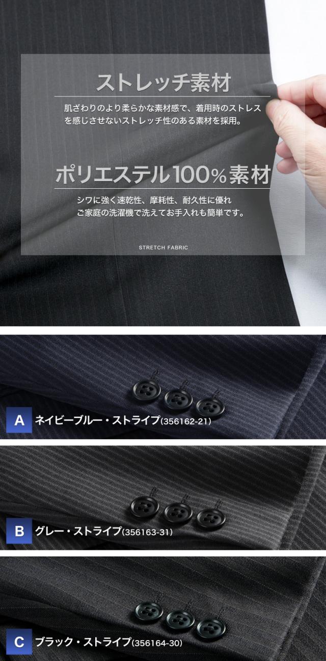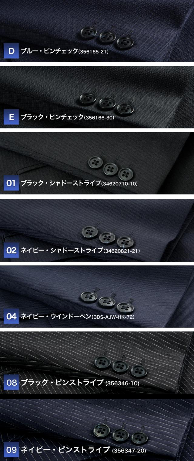 | 【A】ネイビーブルー・ストライプ(356162-21) 【B】グレー・ストライプ(356163-31) 【C】ブラック・ストライプ(356164-30) 【D】ブルー・ピンチェック(356165-21) 【E】ブラック・ピンチェック(356166-30) 【01】ブラック・シャドーストライプ(34620710-10) 【02】ネイビー・シャドーストライプ(34620821-21) 【04】ネイビー・ウインドーペン(BDS-AJW-HK-72) 【08】ブラック・ピンストライプ(356346-10) 【09】ネイビー・ピンストライプ(356347-20) ※2025年10月より色柄を追加して販売しています |
