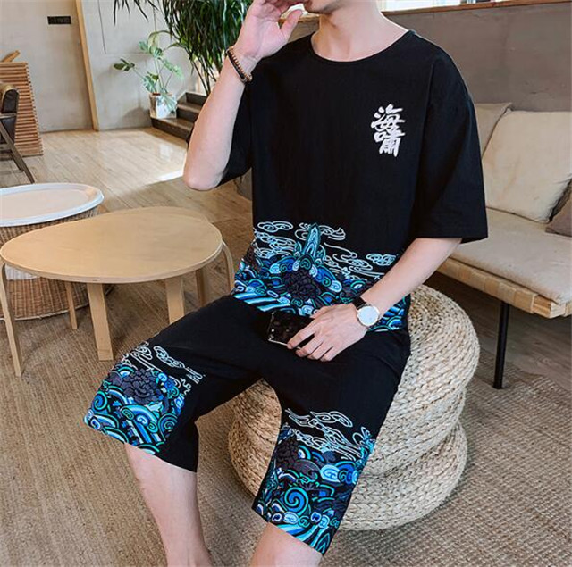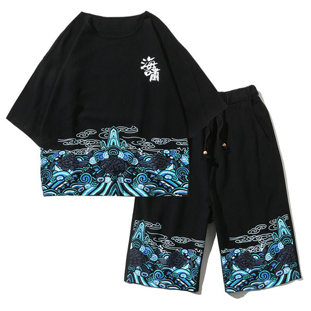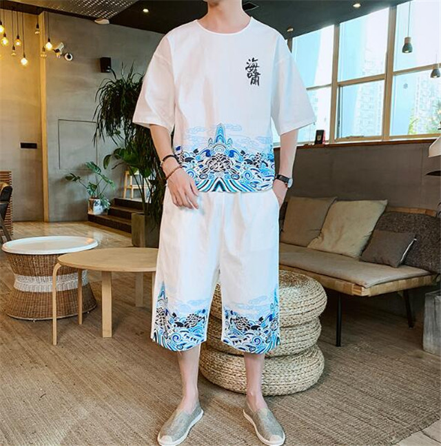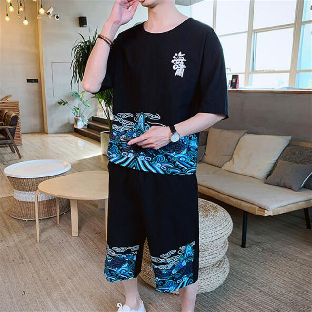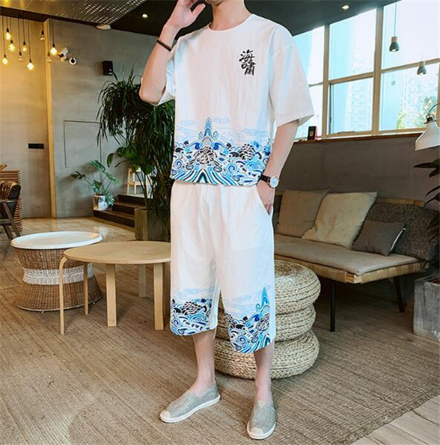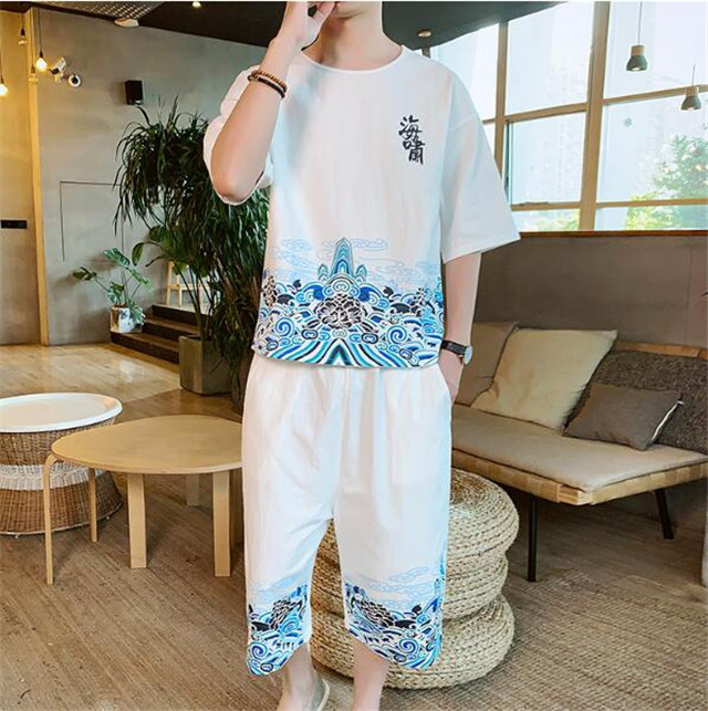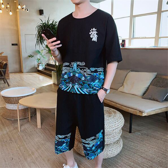 綿麻セットアップメンズ 刺繍スウェットセットアップ ジャージ 半袖シャツ サルエルパンツ ハーフパンツ 薄手 2点セットアップ 夏 大きいサイズ