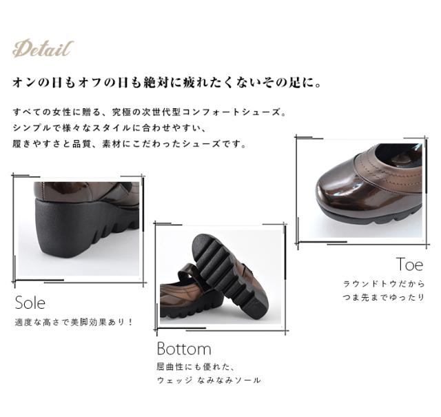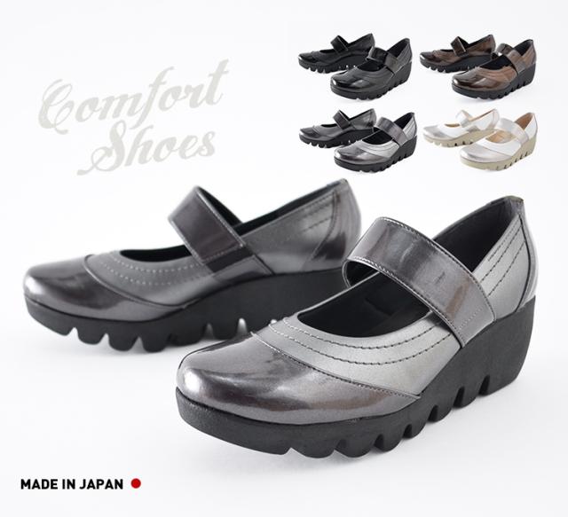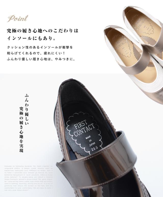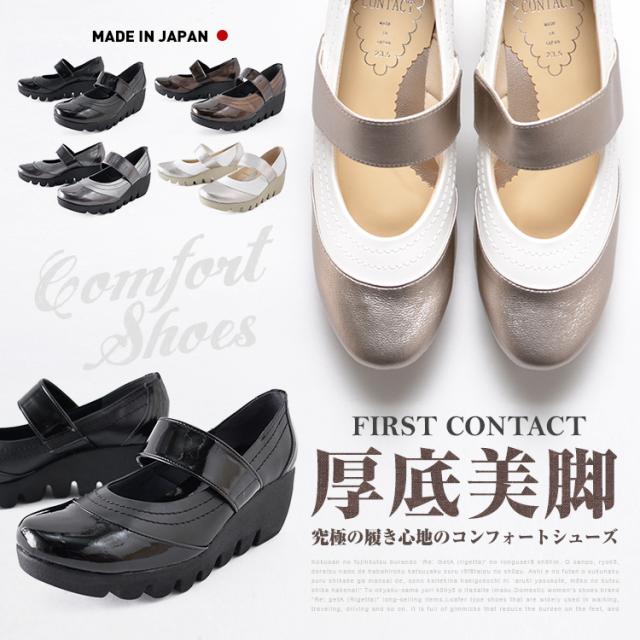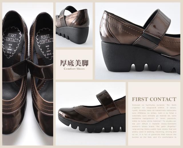 送料無料 First Contact ファーストコンタクト 厚底カジュアルシューズ 日本製 美脚 厚底 カジュアル ウェッジパンプス エナメル ワンストラップ 5.5cmヒール パンプス コンフォートシューズ 39011 パンプス シューズ