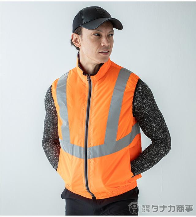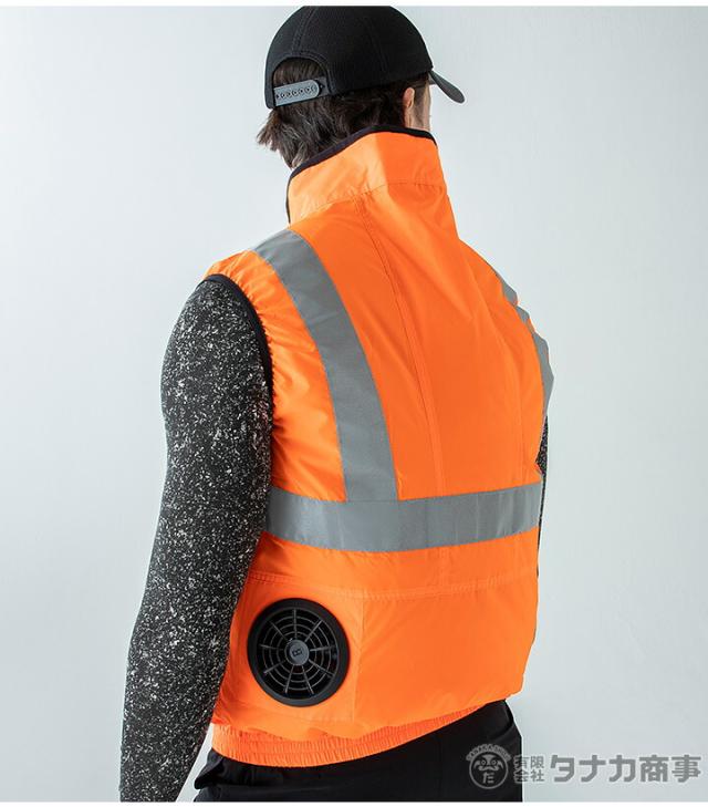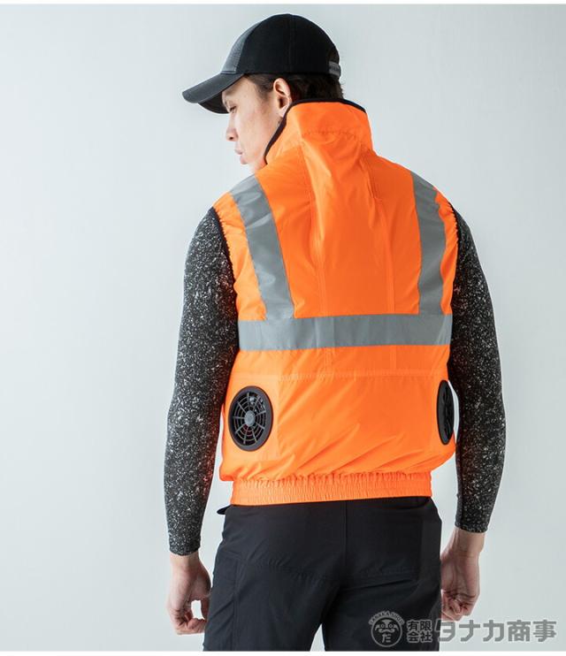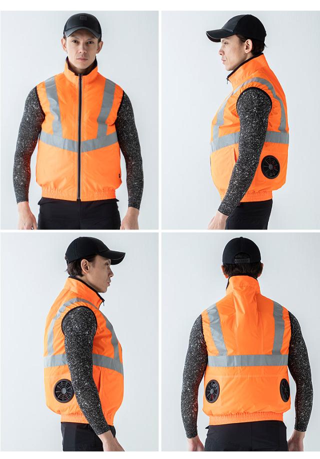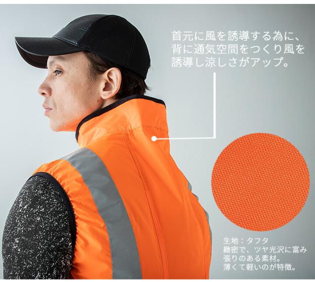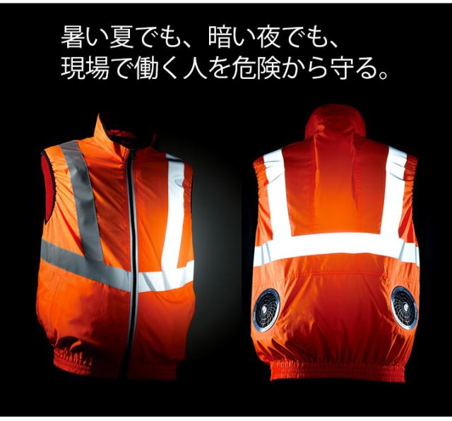 幅広の反射テープで高い視認性を確保。ファンを装備して熱中症対策にも効果的。