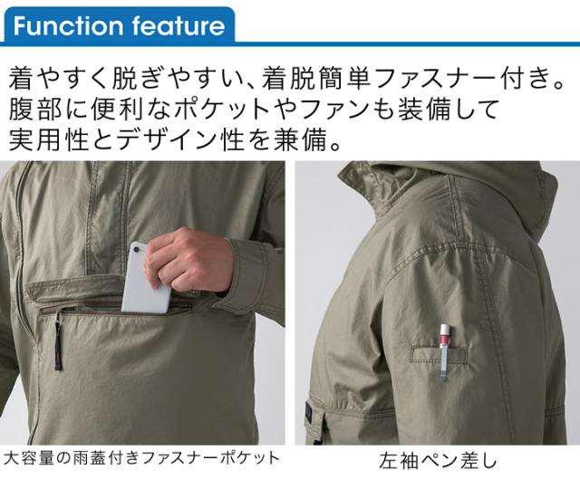 着やすく脱ぎやすい、着脱簡単なファスナー付き。腹部に便利なポケットやファンも装備できる実用性とデザイン性を兼備。