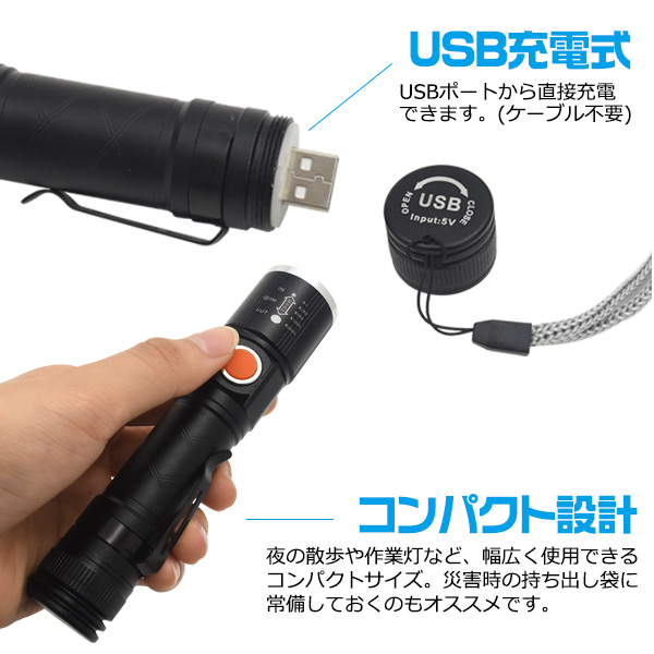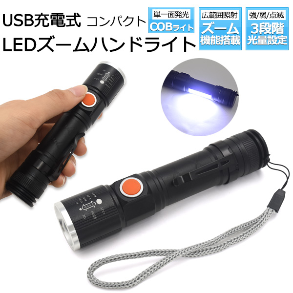 懐中電灯 LEDハンドライト USB充電式 コンパクト LEDズームハンドライト 単一面発行 COBライト LEDライト 3段階光量設定 小型懐中電灯 ミニ懐中電灯 防災用品 黒 防災 防災グッズ アウトドア レジャー 登山 散歩 キャンプ 非常用ライト 備え 会社 事務所