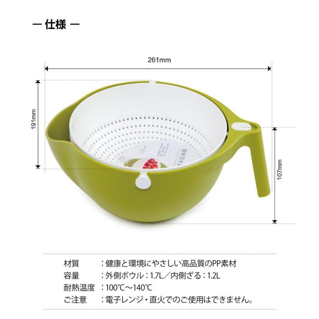 内側はザルとして水切り、外側はボウルとして水を入れることができます。