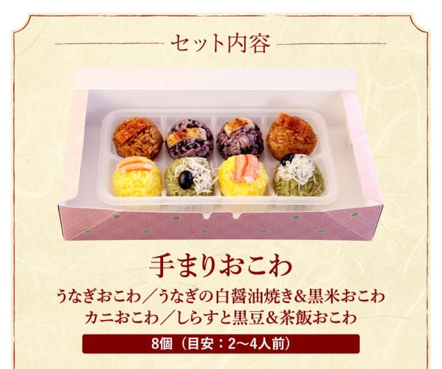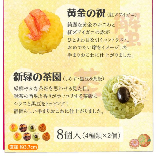 鮮やかな彩りの手まりおこわは、一口サイズの食べやすい大きさ。具材にもこだわり、上品な美味しさに仕上がりました。うなぎ、黒米、カニ、茶飯やしらすなど、4種類の手まりおこわが楽しめます。プレゼントに必ず喜ばれる逸品です。