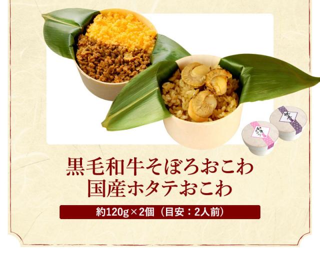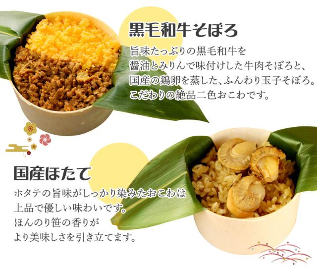 旨味たっぷりの黒毛和牛を醤油とみりんで味付けし、アクセントに生姜を混ぜこんだ牛肉そぼろと、国産の鶏卵を蒸した、ふんわりやわらかな玉子そぼろ。見た目の美しさが食欲をそそる、こだわりの絶品二色おこわです。