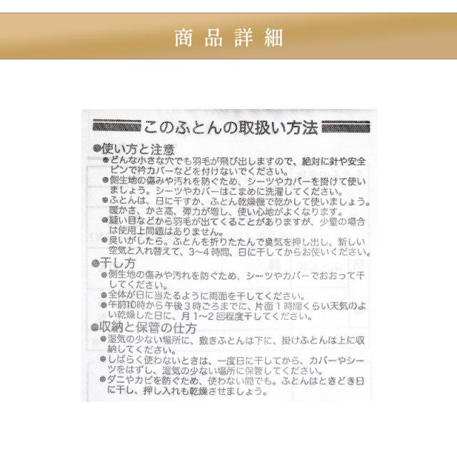 | ・のびのびと飼育された熟成ダウン ポーランドのグースはストレスのない自由な環境で育ちます。しっかりと完熟し、保温性と透湿性が抜群に高く、純白度や耐久性も合わせて世界一と評価されています。 ・食肉〜ダウン清潔な工場で一元管理「アニメックス」は1951年に、食肉関連製品の国営輸出公団「ANIMEX」として創立。生産のプロセスである飼育〜加工にいたる全過程を一貫して把握しています。 ・本物のポーランド産証明書付すべて本物のポーランド産羽毛を使用したものであることが証明されています。証明書のQRコードをスキャンすることで商品に使われているダウンの情報を確認することができます。 ・非常に希少なポーランドマザーグースダウン95%その中でもアニメックスは高品質なグースダウンを提供しており、羽毛布団に使われるダウンとしては非常に希少なダウンとなります。 ・2層キルトふっくらパンパンに張った羽毛布団では、体と布団の間にどうしても隙間ができてしまいます。その隙間を冷たい空気が通る為、ダウンの品質は良いのに「寒い羽毛」となってしまうのです。二層キルトは肌沿いを意識し、上層部と下層部で羽毛の「マス目」を変化させました。ゆったりと肌に沿う、賢いキルトです。 ・超長綿 80サテン超長綿は綿花からとれる非常に長い繊維で、地球上の綿花のたった5%しか生産できない希少価値の高い綿素材です。肌触りが良く、吸湿性に優れた綿は羽毛布団と相性の良い素材。超長綿は通常の綿より繊維が長く、ソフトでしなやか、さらに吸湿性や通気性に優れています。80番手の糸を使用したとてもやわらかな生地です。 | |