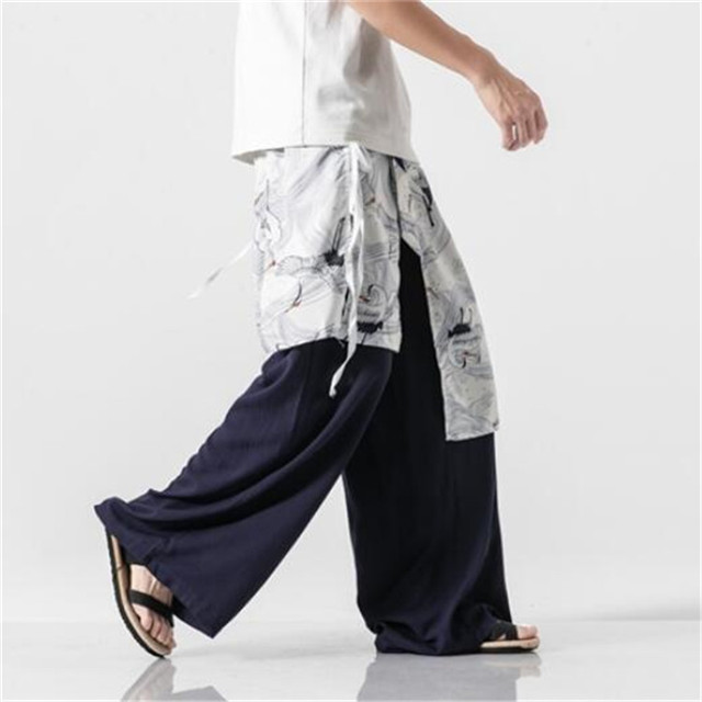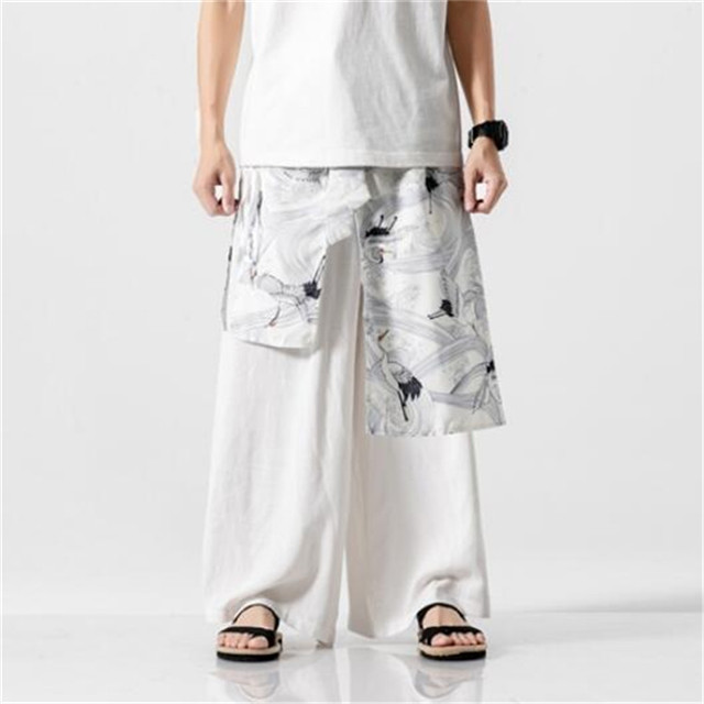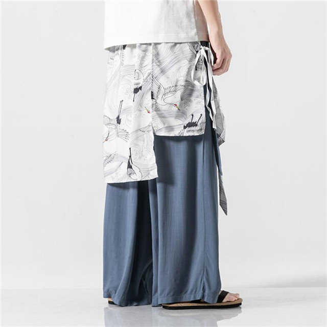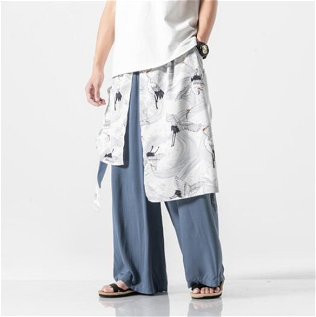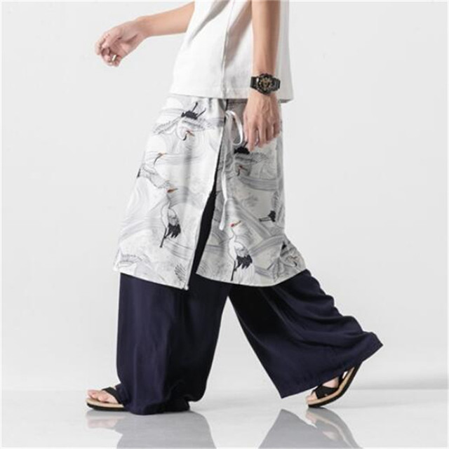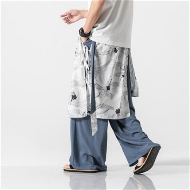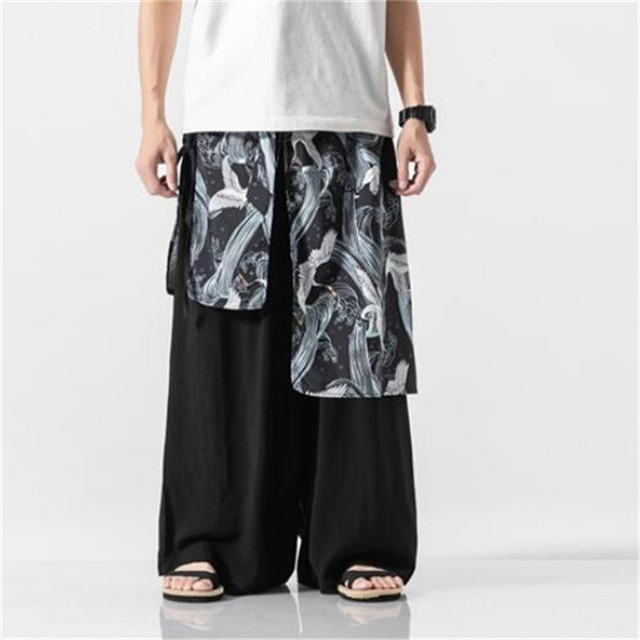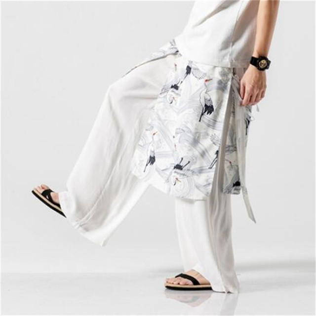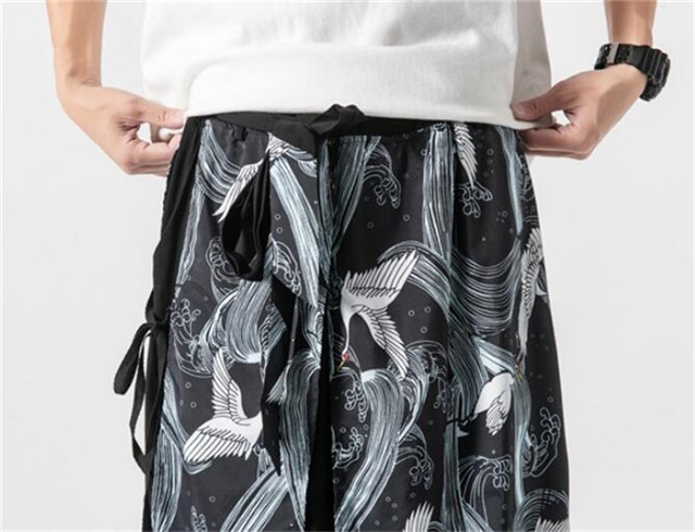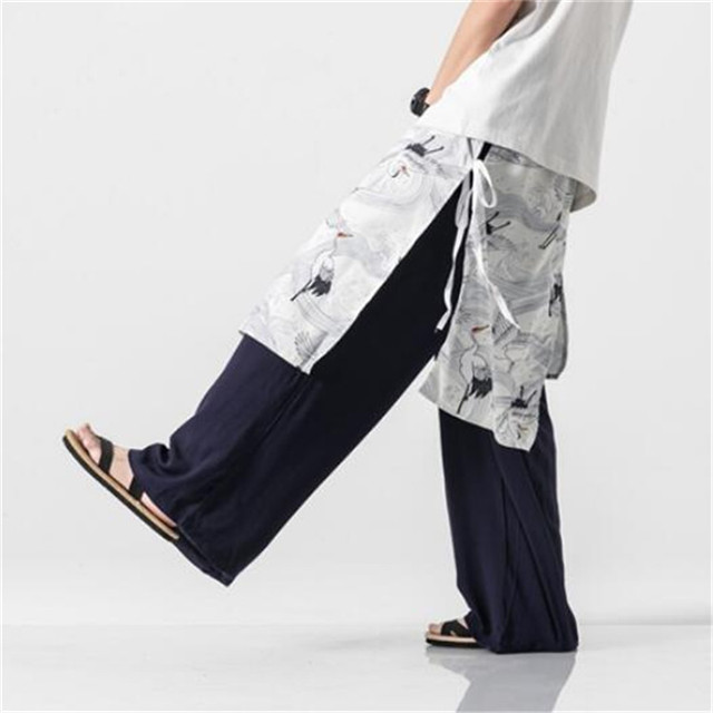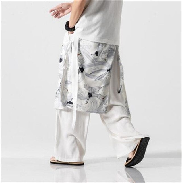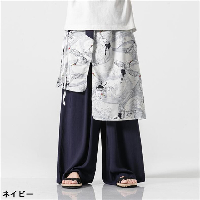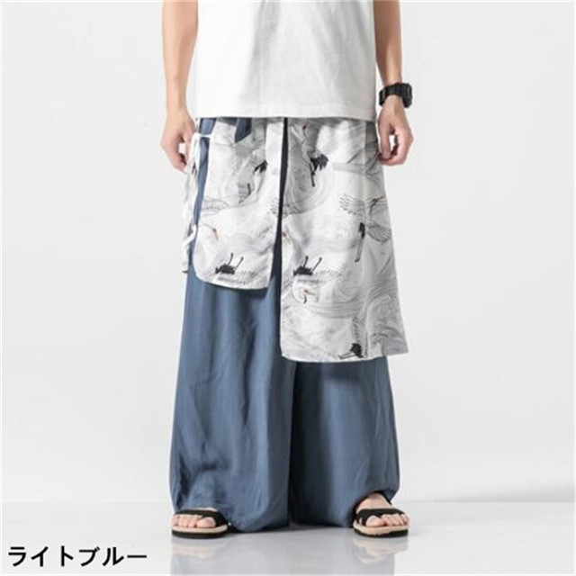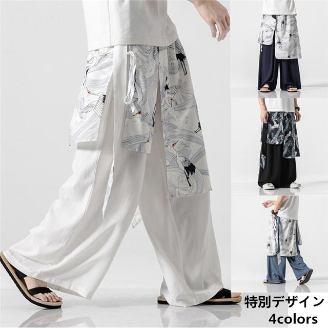 綿麻ワイドパンツ スカートパンツ メンズ 鶴柄 サルエルパンツ チノパン ゆったり 大きいサイズ 涼しい 特別デザイン