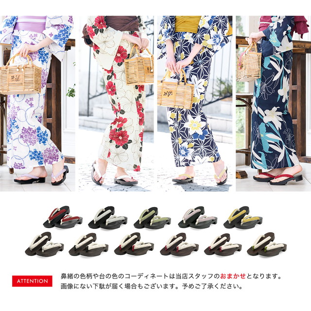 ※鼻緒の色柄や台の色のコーディネートは当店スタッフのおまかせとなります。画像にない下駄が届く場合もございます。予めご了承ください。