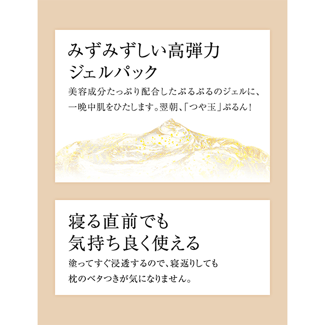 夜塗って寝るだけで、ぷるんとした「つや玉」輝く肌に導くジェルパックです。ハリやみずみずしさがあふれる肌へ整えます。塗って寝るだけのスペシャルケアアイテム