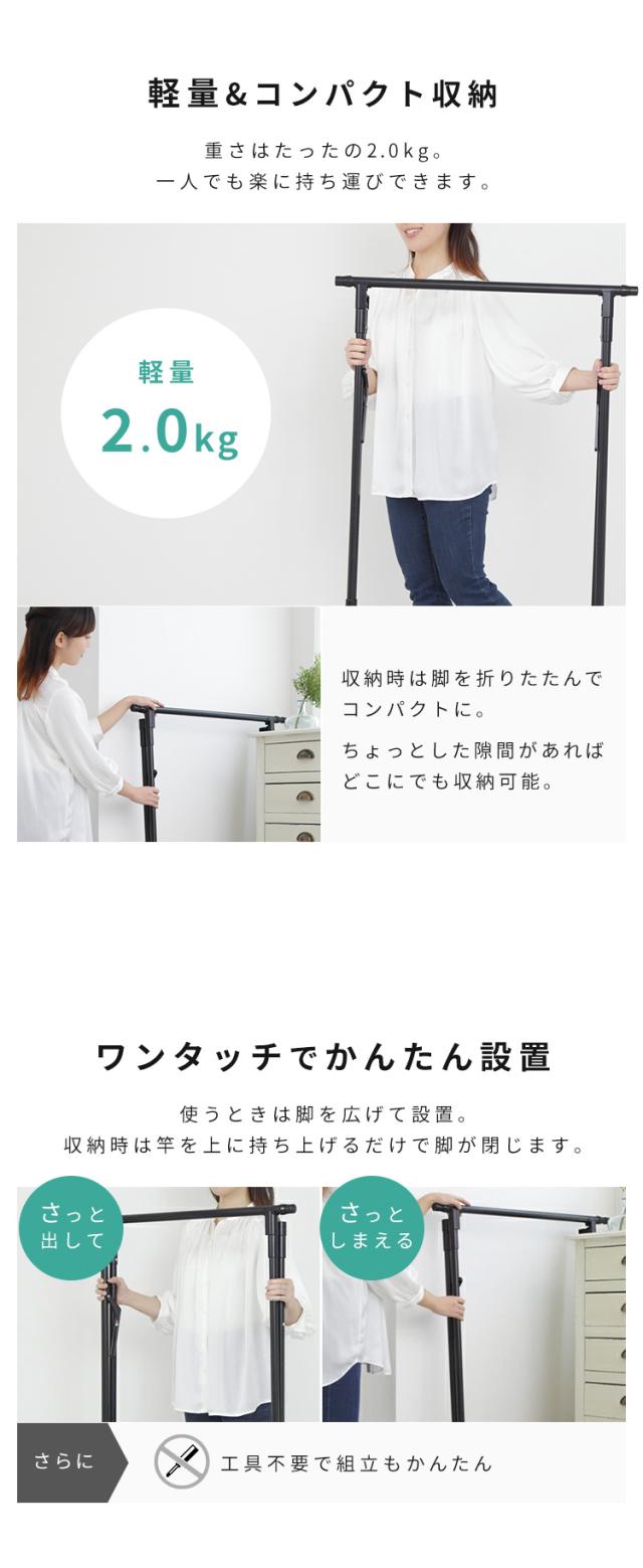 - 注文から1日半程で届いてびっくりしました。 以前にこちらを注文したので、二つ目です。 ワンピースやズボンなど、長めの服は下についてしまう高さなのでそこは注意点です。 我が家では主に掛け布団を干して使っ...