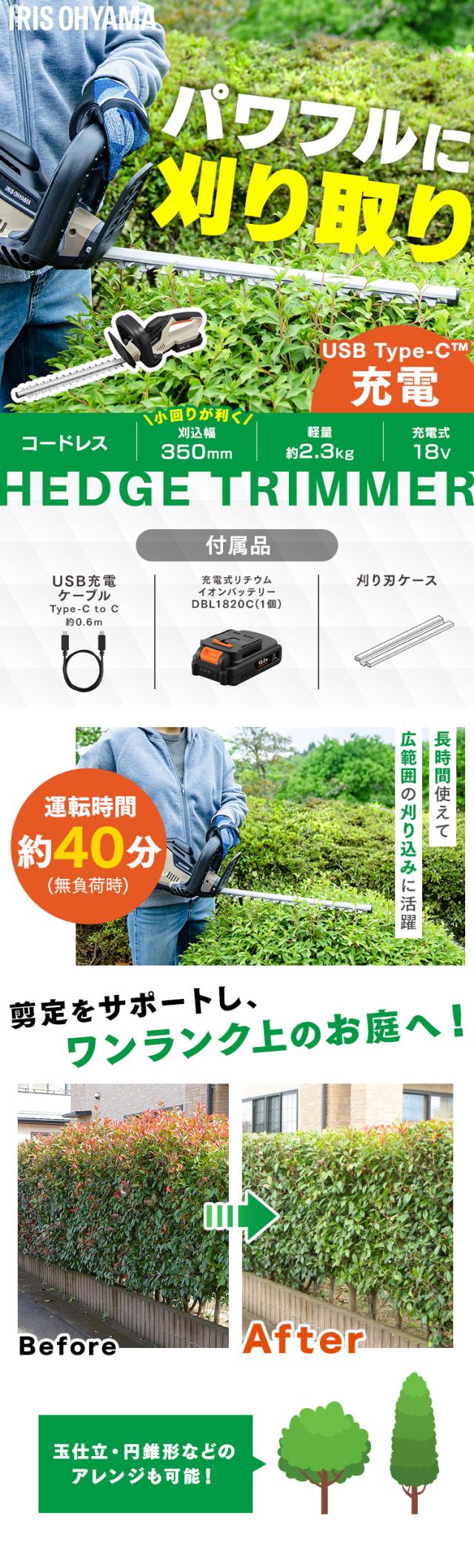 【Type-C充電&バッテリー共用できる】ヘッジトリマー 充電式 18V 電動 軽量 剪定バリカン 枝切りバリカン コンパクト コードレス 生垣 植木 庭木 ブレードカバー付き JHT350TC アイリスオーヤマ *