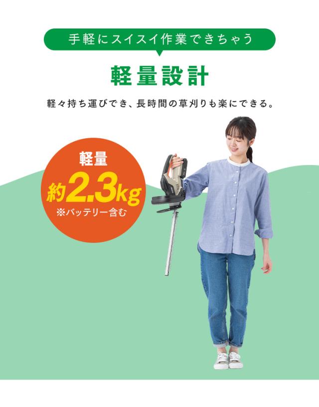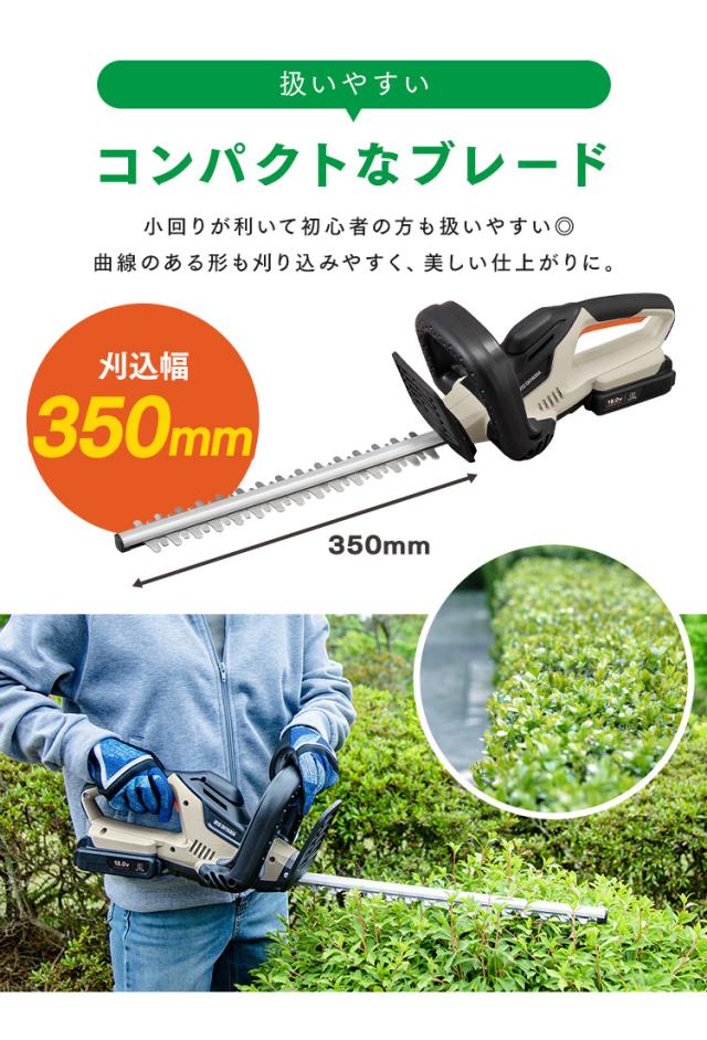 コンパクトなブレード“刈り込み幅:約350mm”で、小回りが利いて初心者の方でも扱いやすいです。