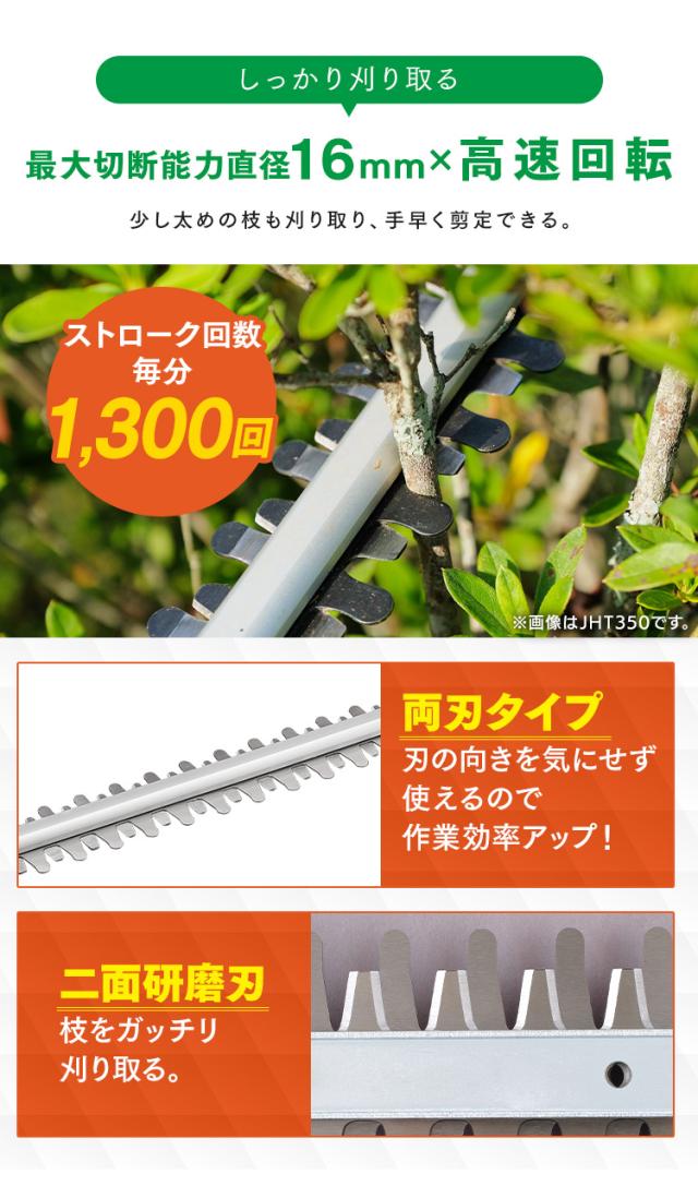 “最大切断能力:直径約16mm×高速回転(ストローク回数毎分1300回)”で、少し太めの枝も刈り取り、手早く剪定できます。