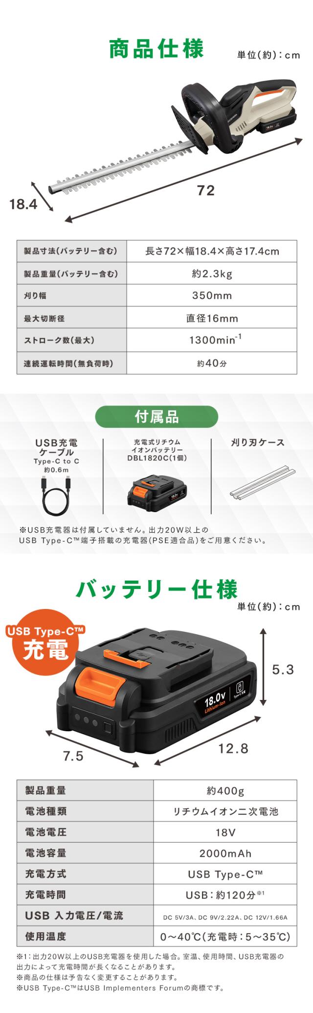 充電式リチウムイオンバッテリー(型番:DBL1820C)、USB充電ケーブル(Type-C to C)