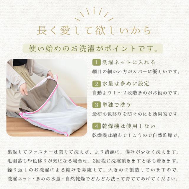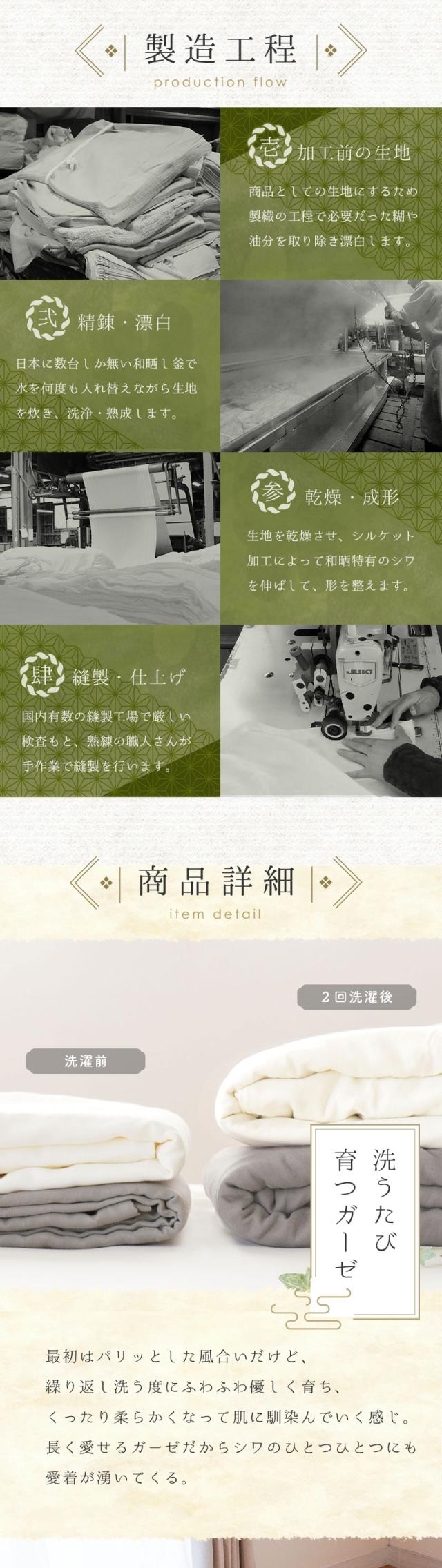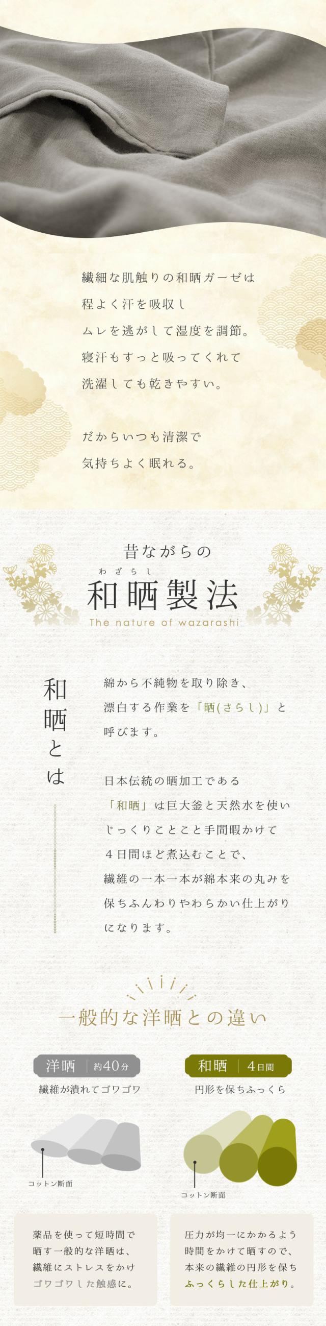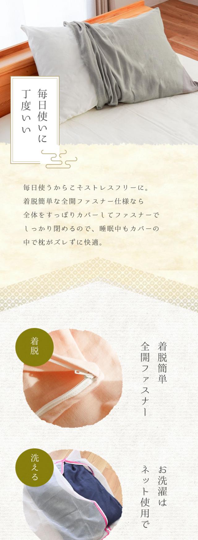 | ・洗うたび馴染むやわらかガーゼ 昔ながらの製法で手間暇かけて仕上げられるからこそ生まれる、どこか懐かしいピュアなガーゼ。繊細な肌触りの和晒ガーゼは寝汗をすっと吸ってくれて、洗濯しても乾きやすい。洗うたびに肌にすっくり馴染みどんどん身近な存在になる感じがたまらなく愛おしい。 ・伝統的な和晒(わざらし)製法綿から不純物を取り除き、漂白する作業を「晒(さらし)」と呼びます。日本伝統の晒加工である「和晒」は、巨大釜と天然水を使い、手間暇かけてじっくり4日間煮込むことで、繊維の一本一本が綿本来の丸みを保ち、ふんわりやわらかい仕上がりになります。 ・全開ファスナーで着脱簡単端まで開く全開ファスナーで着脱簡単。日々のお手入れの手間を軽減します。全体をすっぽりカバーしてファスナーできっちり閉めるので、睡眠中もカバーの中で枕がズレずに快適です。 ・安心の日本製生地の裁断から仕上げに至るまで、自社国内工場で行っていて、徹底した品質管理がなされています。 | |