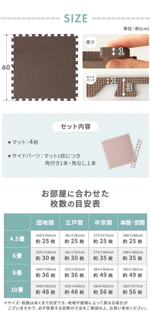 【4枚セット】ジョイントマット PEジョイントマット カラージョイントマット 60cm×60cm 厚み1cm 床暖房対応 ジョイント 大判 防音 一年中 防水 サイドパーツ 厚さ1cm 60×60cm ベージュ ブラウン イエロー ピンク グリーン PEJTM-601 送料無料
