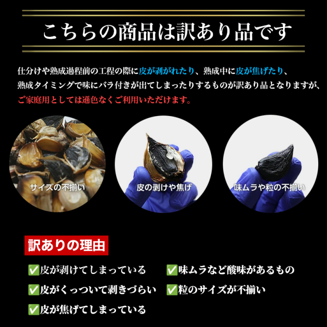 味むら、粒の不揃い、皮むけなどはございますが コストを落として健康維持したい方に 黒にんにくの成分は一切変わりませんので 店長のおススメの一品です