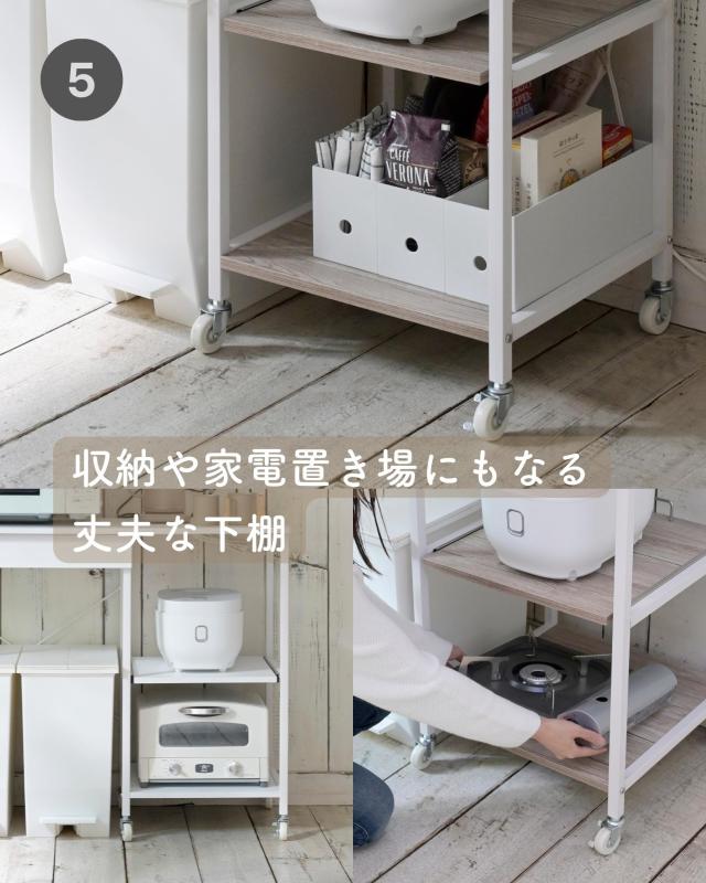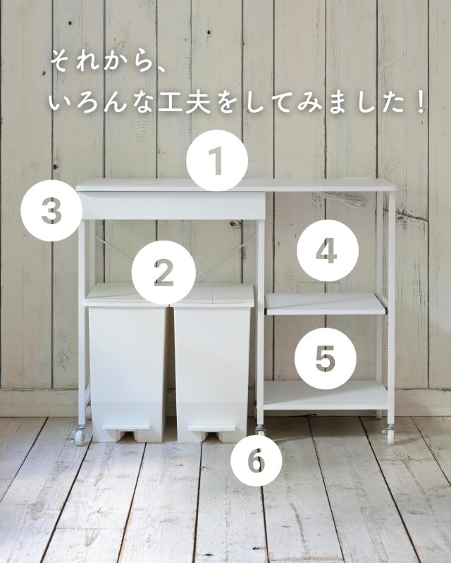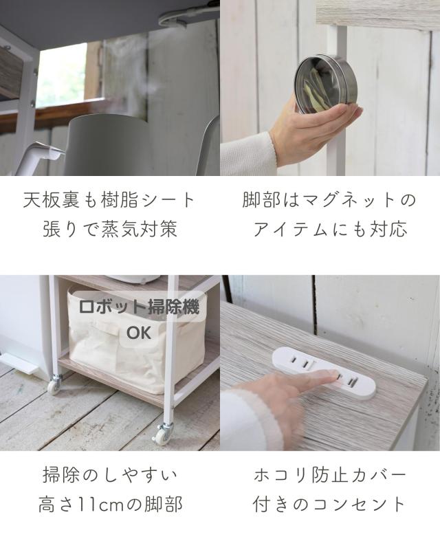 | 商品説明 | ●ゴミ箱上を活用する、しっかり頑丈なキッチンラック ●蓋付きゴミ箱も収納可能なサイズ設計 ●キッチンの高さに合わせやすいロータイプ ●天板ゆったり奥行き45cmで、大型レンジも設置可能 ●天板にはホコリ予防のコンセント付き(2口合計1500Wまで) ●水にも強いPVCで、作業台としても活躍 ●引出しはレール付きで、開け閉めラクラク ●オープン部は蒸気の出る家電も安心なスライド棚 ●下棚も頑丈で、重い物も収納可能 ●キャスター&脚長で、日ごろのお掃除もしやすい設計 ●動かしやすい単輪キャスター4個(うちストッパー付き2個) 【2023年11月1日より、従来品をモデルチェンジ】 ・縦長サイズから、圧迫感のないロータイプ&幅広サイズに ・ゴミ箱収納スペースに加え、小物をしまう浅型引出しを追加 ・キャスターにストッパーを追加 ・シンプルな白と、インテリアになじむ木目系の計3配色● ●天板サイズ: 幅102 奥行45cm ●コンセント位置:奥から3cm、右端から3.5cm ●引出し内寸: 幅46.5 奥行33.5 深さ4.5(有効高さ 6)、間口奥行21.5、スライド幅約27cm ●引出し下内寸:幅55.5 奥行40 高さ74cm ●スライド棚内寸:幅38 奥行37 高さ39、スライド幅約18.5cm ●下棚内寸:幅40 奥行40 高さ29.5cm ●下部隙間:高さ11cm ●2口コンセント付属(合計1500Wまで)、コード長さ1.8m ●天板耐荷重: 30kg ●引出し耐荷重: 3kg ●スライド棚耐荷重: 7kg ●下棚耐荷重: 10kg |