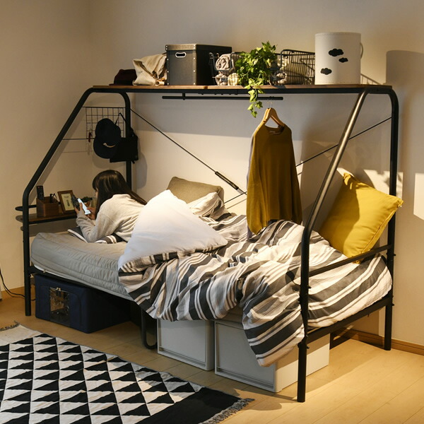 多機能 ベッド 棚付き コンセント付き 収納 ハンガー付き パイプベッド メッシュベッド ベッドフレーム ベット システムベッド ぐうたらベッド 子供部屋 一人暮らし 1人暮らし 新生活 山善 YAMAZEN 【送料無料】