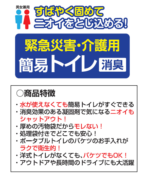 | 商品説明 | ●水がなくてもトイレが出来る ●緊急災害・介護用簡易トイレ ●すばやく固めてニオイを閉じ込める ●セット内容:汚物袋・凝固剤・処理剤 ●消臭効果のある凝固剤で気になるニオイもシャットアウト ●厚めの汚物袋だからモレない ●処理袋付きでどこでも安心 ●洋式トイレがなくてもバケツでもOK 【使用方法】 ・使用後、汚物袋の中の汚物に凝固剤をふりかける ・処理袋に入れて廃棄する |