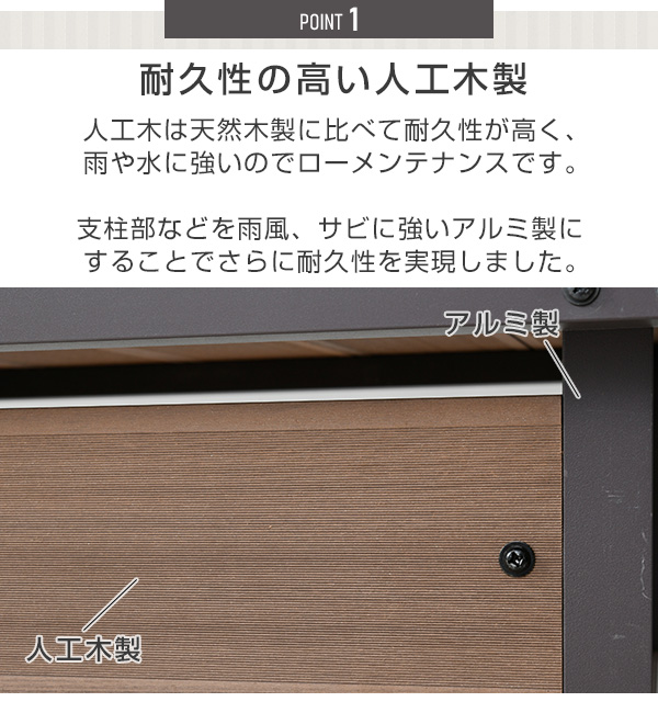 | 材質 | 構造部材:木粉混合ポリエチレン、アルミニウム |